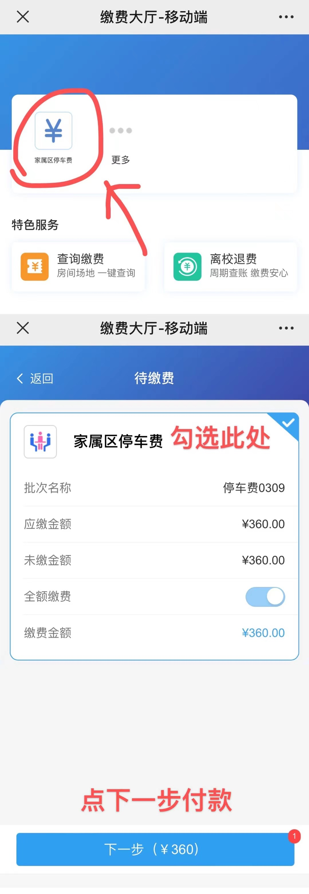 二、缴费方式2:登记了身份信息的,可登录以下网址在首页选择“家属区停车费”项目完成缴费;