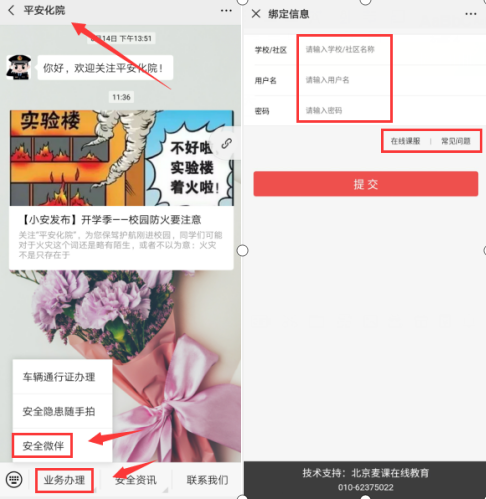 ▶点击公众号菜单【业务办理】→【安全微伴】→【开始学习】进入登录页面之后→输入学校名称、用户名、密码,点【提交】绑定信息,即便更换了设备,只要个人微信号没变,也可直接访问平台,无需再次绑定;