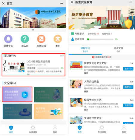 ▶【首页】→【新生安全教育】进入课程学习;