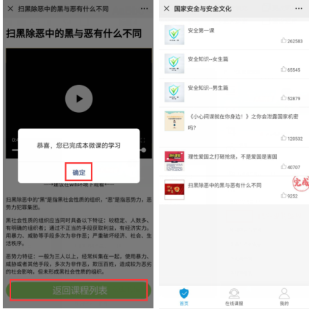 ▶微课学习完成后会有“恭喜,您已完成本微课的学习”的提示,需点击【确定】,再点击【返回课程列表】,方可记录微课完成状态,已完成的微课会显示“完成”二字,并排在所属微课分类下方;